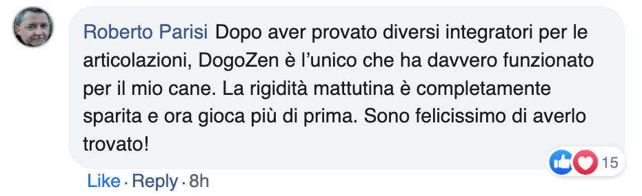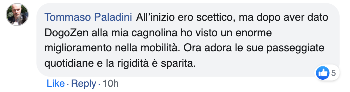 Sì! È fantastico. Ho iniziato a dare a Rex DogoZen già dalla prima settimana e la sua energia è tornata alle stelle. Non zoppica più e si muove con una facilità che non vedevo da mesi. Onestamente, è tornato ad essere il cane felice e vivace di sempre.
