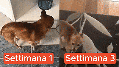 Settimana 3: Kira era un cane completamente diverso. Persino in alcuni momenti si mise a correre felice! Una trasformazione totale.